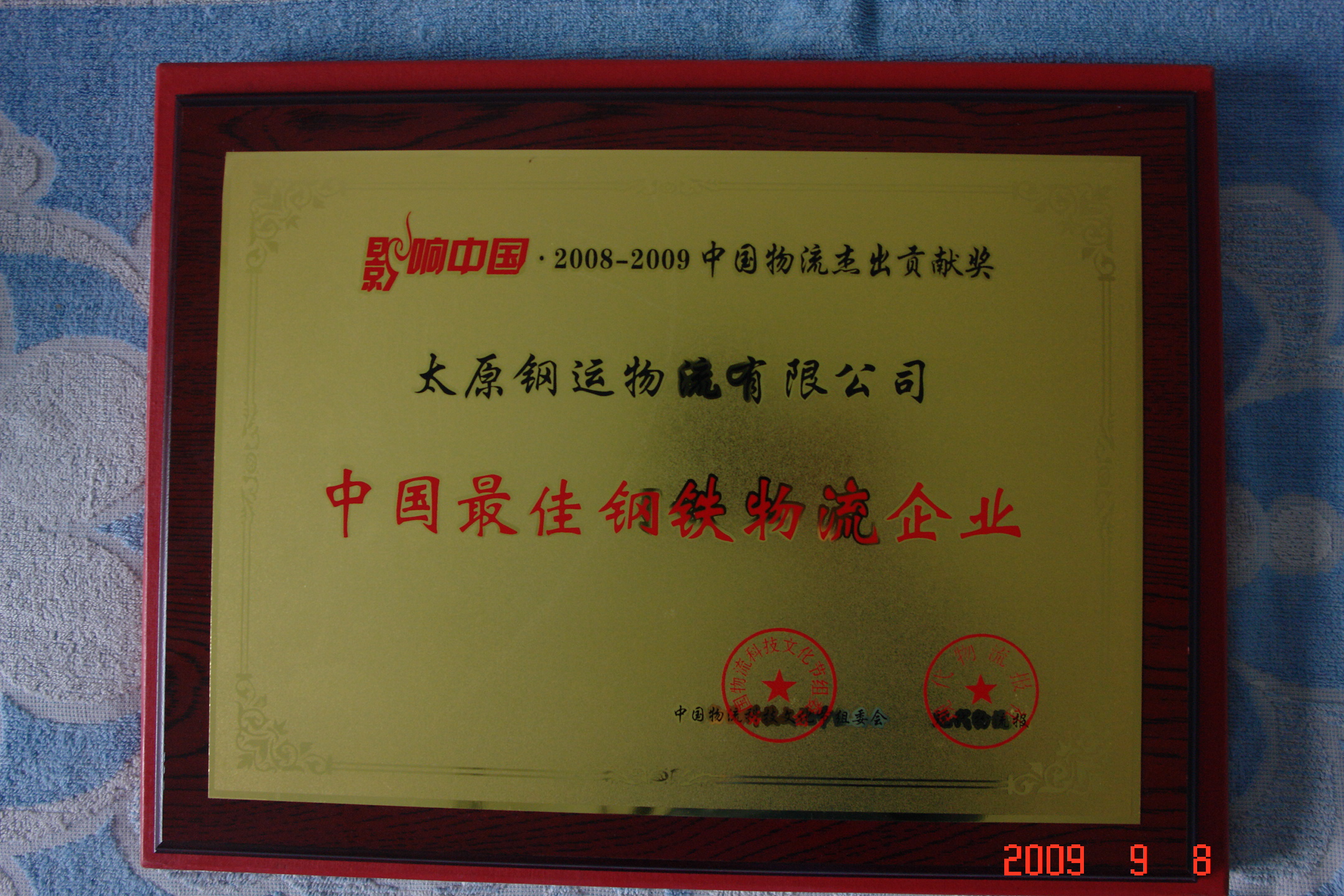 2009年9月3日,我公司在"第三屆中國(蘇州)國際物流與供應(yīng)鏈合作發(fā)展高峰論壇"暨"影響中國2008--2009中國物流杰出貢獻(xiàn)獎"表彰活動中,被授予"中國**佳鋼鐵物流企業(yè)"榮譽(yù)稱號。