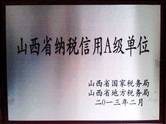 2013年6月14日,我公司榮獲省國(guó)稅、地稅聯(lián)合頒發(fā)的“山西省納稅信用A級(jí)單位”榮譽(yù)稱號(hào)。